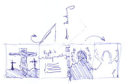 Visuell wird das Thema Gebrauchsanleitung NICHT aufgegriffen. Bild/Grafik sollem im Gegensatz zum Text die Doppeldeutigkeit darlegen. Erste Idee ist es mit Klappseiten zu arbeiten. Klappseiten haben im Gegensatz zu z.B. Transparenzen den Vorteil das sie etwas (inTeilen) überdecken und abändern. Denn das die eigentliche Bedeutung wieder sichtbar wird ist das Ziel des Buches, und dazu muss die eigentliche Bedeutung "aufgedeckt" werden. sie leuchtet nicht selbstverständlicher Weise durch.